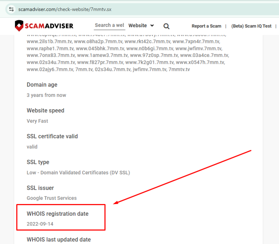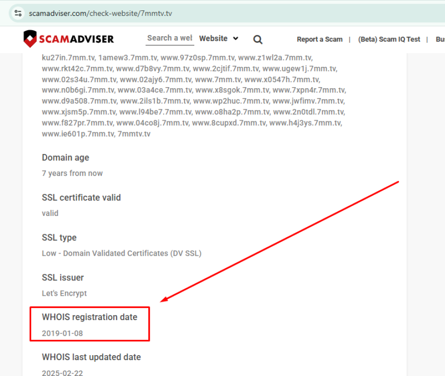 According to WHOIS and ScamAdviser data, the domain 7mmtv.sx was registered on September 14, 2022. Another domain linked to the platform, 7MMTV.tv, was registered earlier on January 8, 2019.