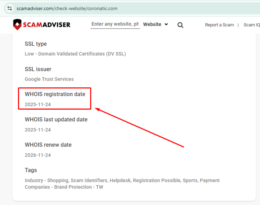 The domain registration date—November 24, 2025 according to ScamAdviser—puts Coronatic.com firmly in the “too new to trust” category.