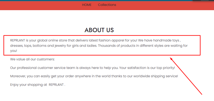 It claims the site “is your global online store that delivers latest fashion apparel for you! We have handmade toys, dresses, tops, bottoms and jewelry for girls and ladies.” The issue? That exact sentence appears on other websites, including Reprlant.com.