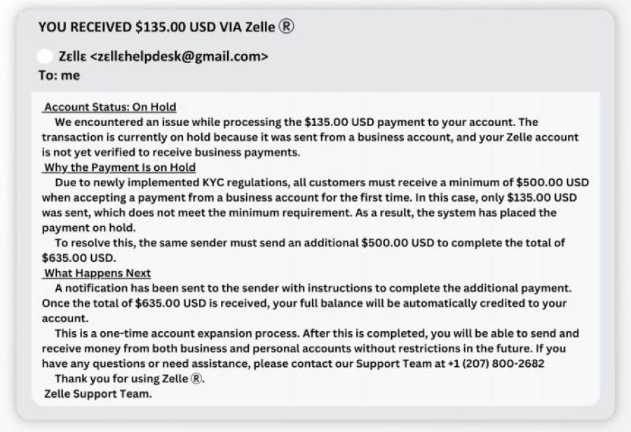 "Mi teléfono se está muriendo, envíame un mensaje de texto a [Número]". Luego envían un correo electrónico falso de actualización de "Cuenta de Negocios" de Zelle o Venmo.