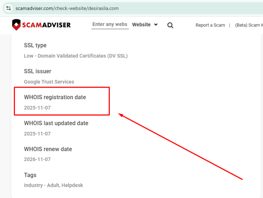 According to WHOIS records, DesiRasila.com was registered on November 7, 2025. That makes it a fairly new domain with only a short operating history.