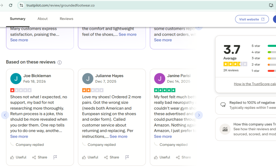 At first glance, the numbers look reassuring. On Trustpilot, Grounded Footwear has a 3.7 rating based on 2,159 reviews, which suggests a generally decent customer experience.