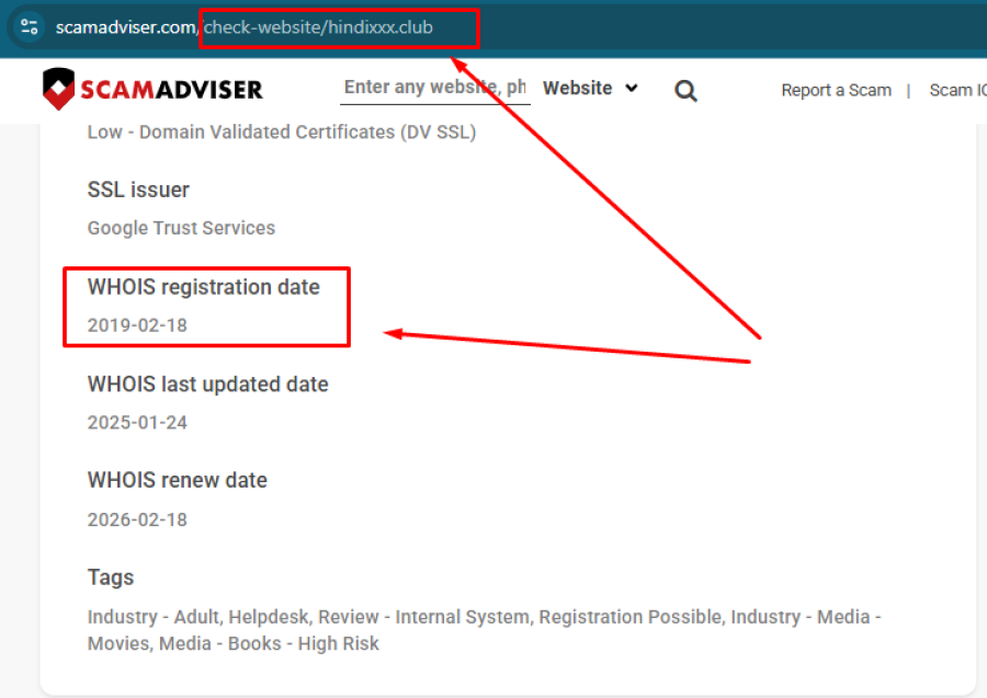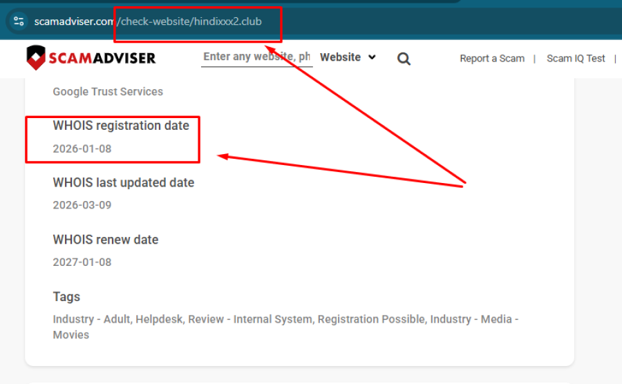 It looks new on paper, but it likely isn’t entirely new in practice. The domain hindixxx2.club was registered in January 2026, but there are clear signs it evolved from hindixxx.club, a domain first registered in February 2019.