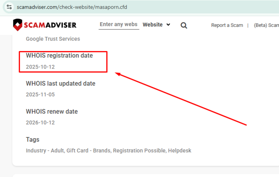 WHOIS records show that Masaporn.cfd was registered on October 12, 2025. That means the domain has been active for only a relatively short period.