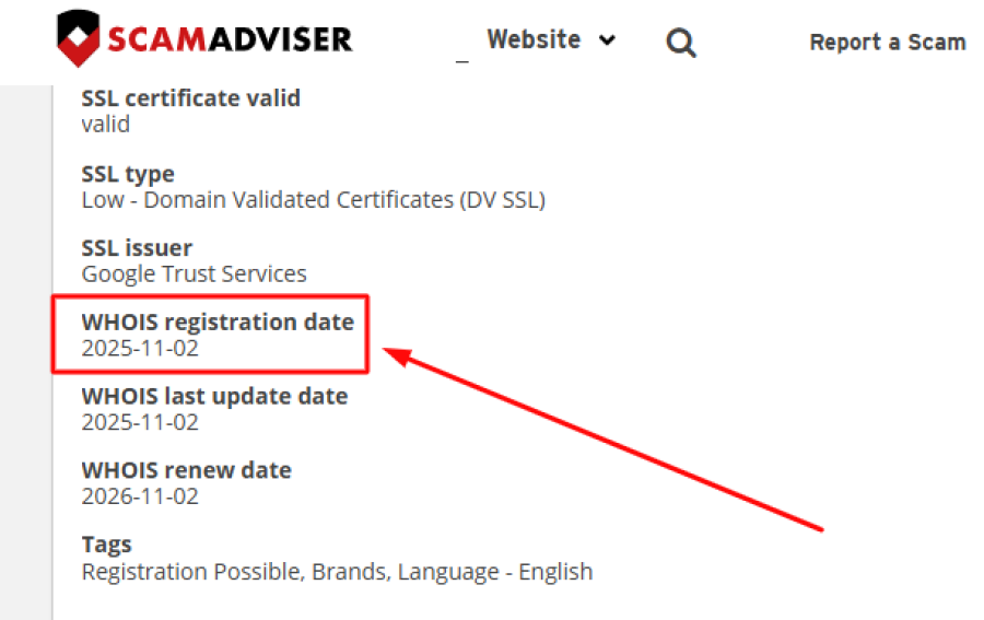 According to WHOIS LookUp and ScamAdviser, Slotjp555.online was registered in November 2025. A new registration does not automatically mean scam. However, the .online domain and its use as an “alternative link” suggest it is either a new site or a new address for an older operation.