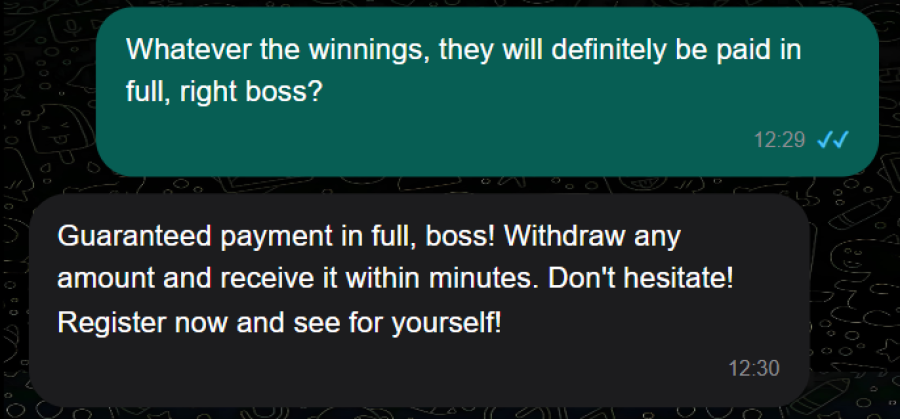 “Guaranteed payment in full, boss! Withdraw any amount and receive it within minutes. Don't hesitate! Register now and see for yourself!”