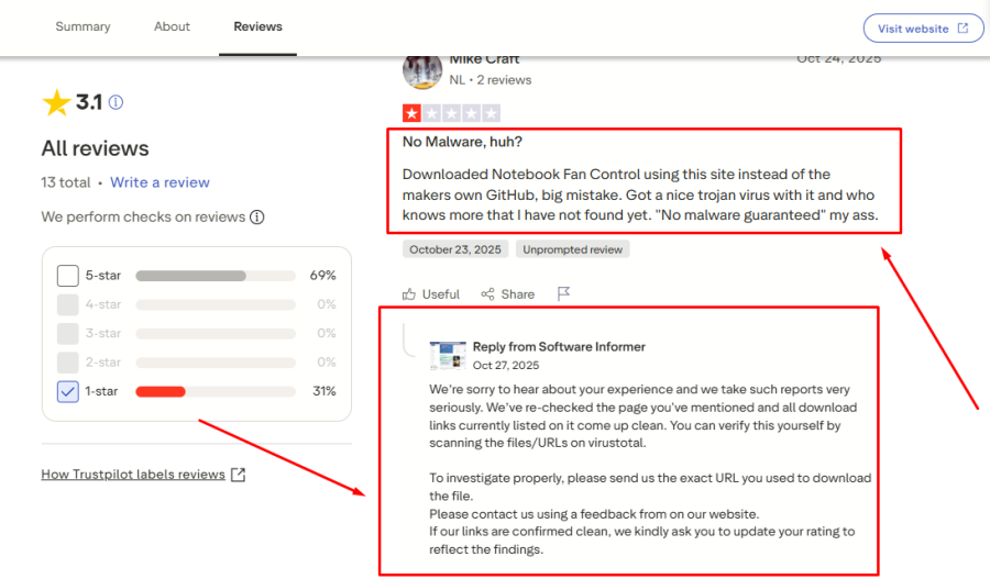 One Trustpilot reviewer shared a concerning experience, claiming they downloaded Notebook Fan Control from Software Informer instead of the developer’s GitHub page and ended up with a Trojan virus. The reviewer questioned the site’s “no malware guaranteed” claim.