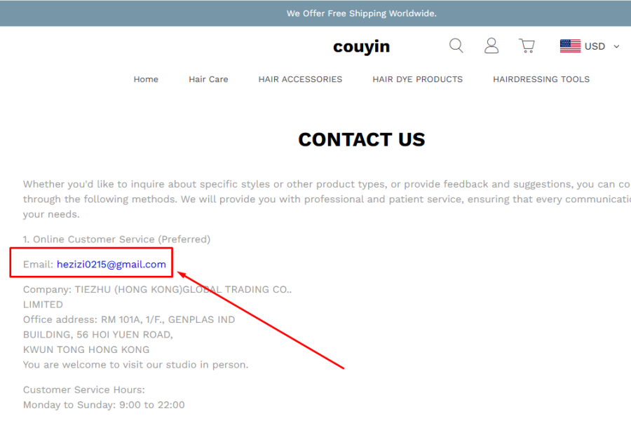 Professionelle Unternehmen verwenden markengeschützte E-Mail-Adressen, wie z. B. "support@couyin.com", um mit ihren Kunden zu kommunizieren. Couyin.com verwendet stattdessen "hezizi0215@gmail.com" für seinen gesamten Kundendienst. Dies ist ein großes Warnsignal, denn kostenlose Gmail-Konten bieten keinerlei Rechenschaftspflicht und können gelöscht werden, sobald ein Betrug gemeldet wird.