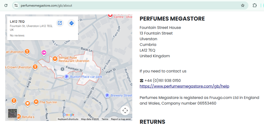Il sito rivendica la proprietà di Fruugo.com Ltd, una società registrata in Inghilterra e Galles con il numero di società 06553460. Questa entità aziendale è un gigante legittimo nel mondo dell'e-commerce, che opera come mercato piuttosto che come rivenditore diretto. Ciò significa che Perfumesmegastore è solo un pezzo di un puzzle molto più grande.
