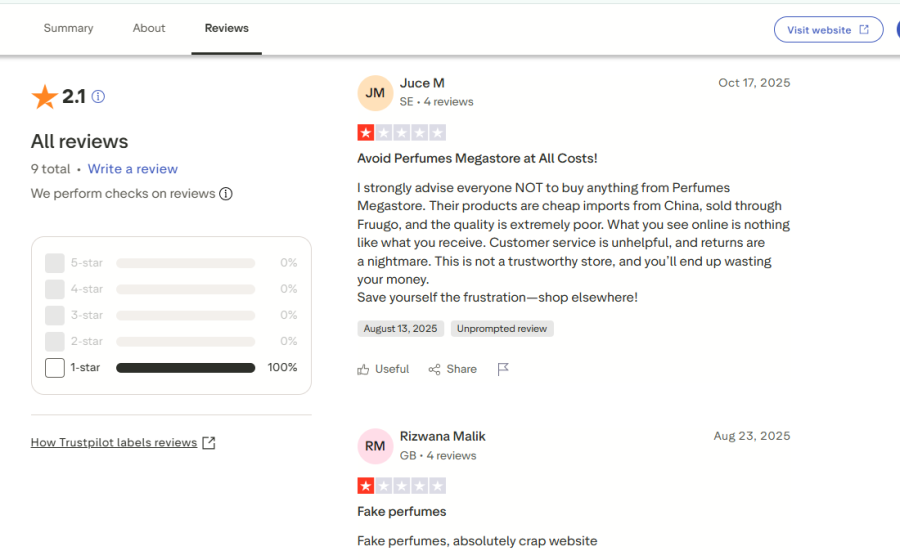 Se si guarda a Trustpilot, il feedback di Perfumesmegastore.com è tutt'altro che entusiasmante. Con un punteggio di 2,1 stelle, la comunità ha espresso una notevole frustrazione riguardo a ciò che arriva per posta. Molti clienti hanno esplicitamente avvertito gli altri di stare alla larga dal sito.