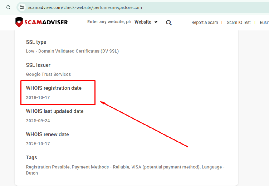 La data di registrazione WHOIS di Perfumesmegastore.com è 2018-10-17, quindi ha più di cinque anni. Nel mondo dello shopping online, un sito che dura più di un anno è solitamente considerato più stabile di un'operazione "fly-by-night". Tuttavia, la longevità non è uno scudo contro le cattive pratiche commerciali.