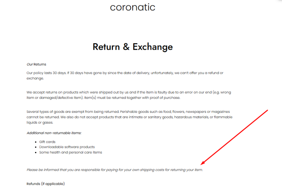 Coronatic.com afferma chiaramente che i clienti sono responsabili del pagamento delle spese di spedizione per la restituzione.