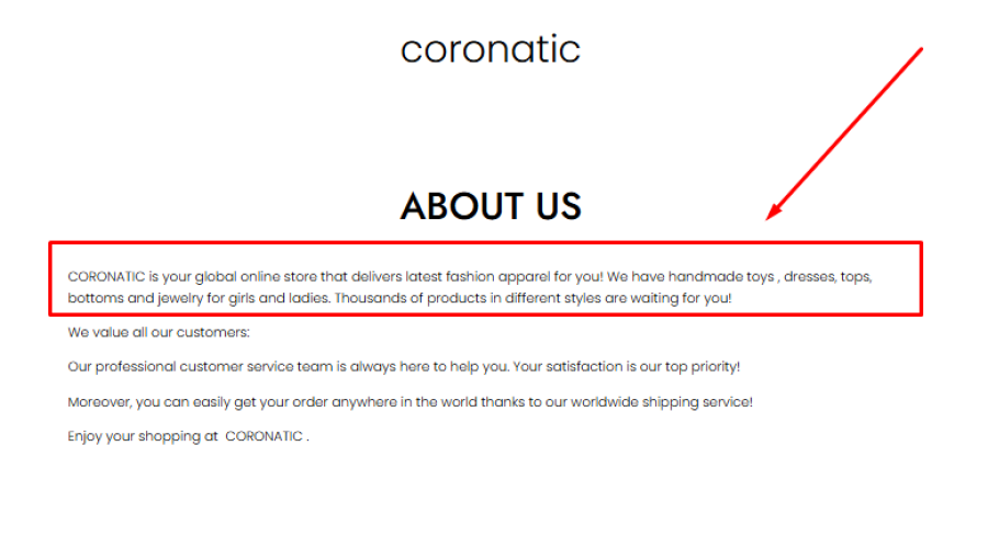 A prima vista, Coronatic.com si presenta come un negozio di moda online globale che offre di tutto, da abiti e top a gioielli e persino giocattoli fatti a mano. Sembra un'idea ampia, ma ancora credibile.