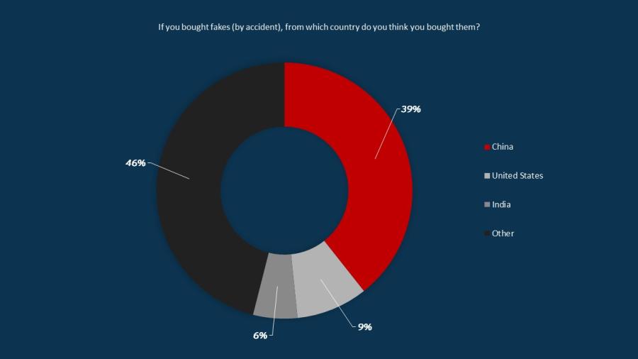 When asked to name the originating selling country of their fake goods, 39% of consumers named China. This was followed by, surprisingly, the United States (9%) and India (6%).
