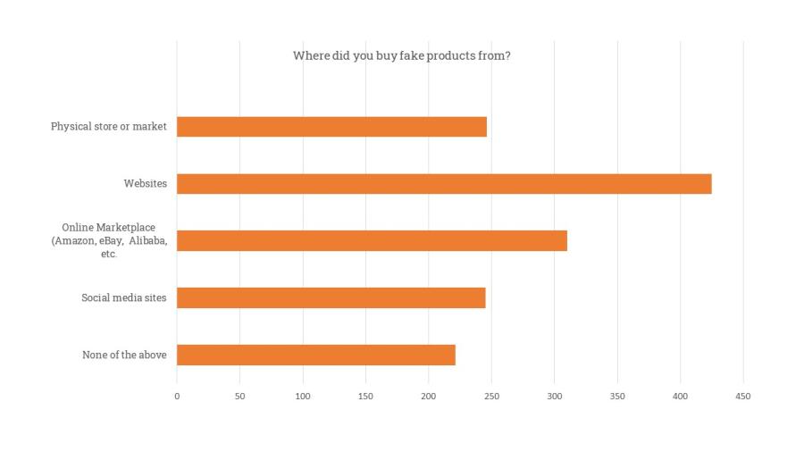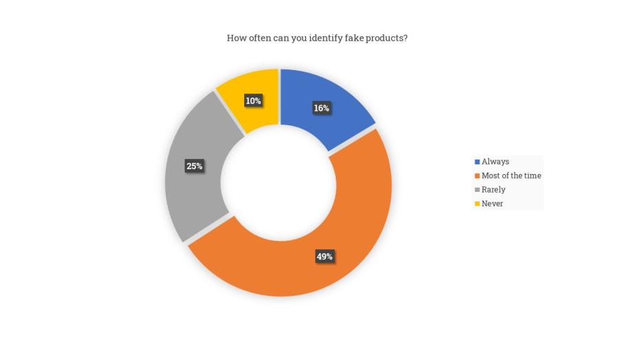 Still, 57% of the consumers have bought a fake product in the past unknowingly or doubting the originality of the product. 18% admit to knowingly having bought fakes. Clothing, electronics and accessories are the most commonly purchased fake products.