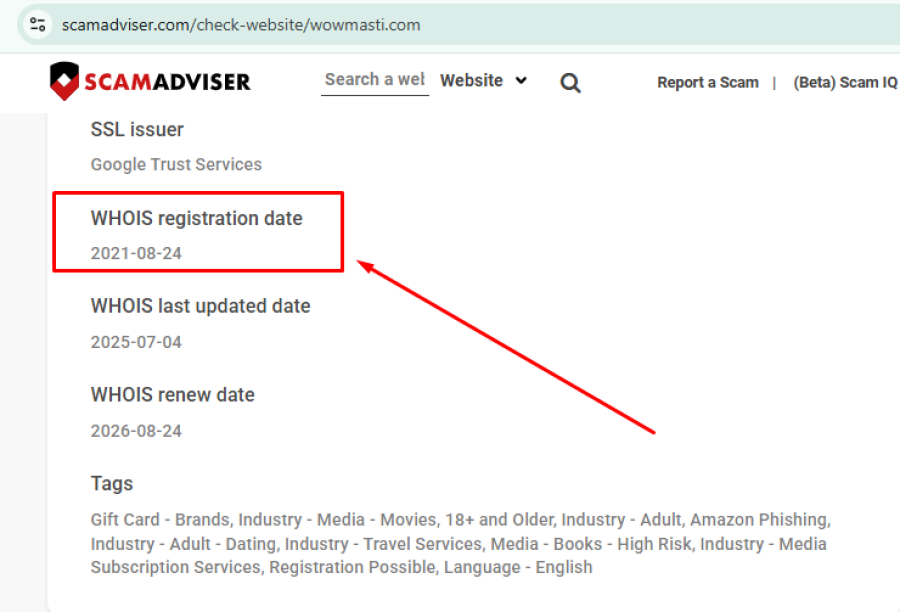 According to Whois domain records & ScamAdviser, WowMasti.com was registered on August 24, 2021.